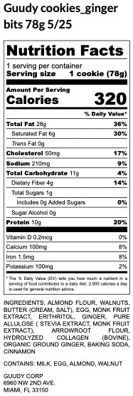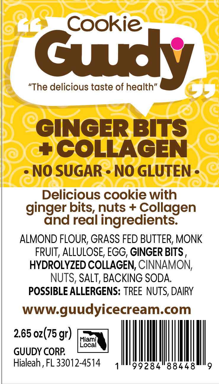 Semi-sweet • NO Gluten. Delicious COOKIE with ginger bits, walnuts + collagen. Real ingredients. 75gr. 10gr Protein
